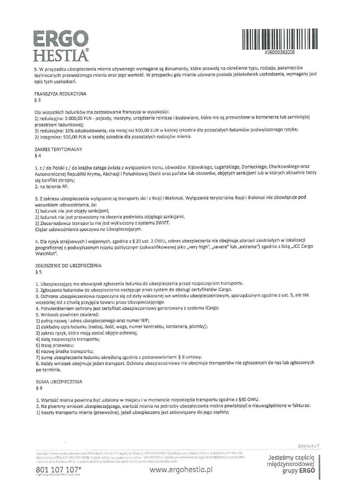 Załącznik numer 3 – warunki ubezpieczenia CARGO